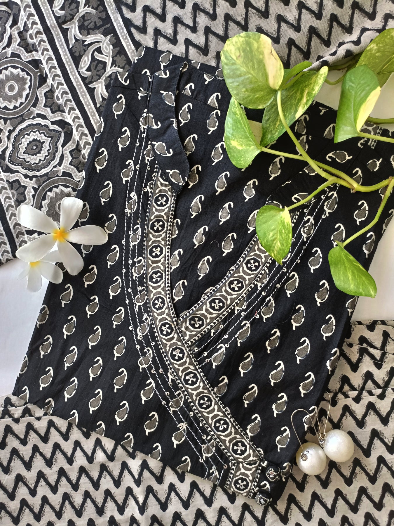 Black Bagru Hand Block Pritned Angrakha Kurta Set(3pc)