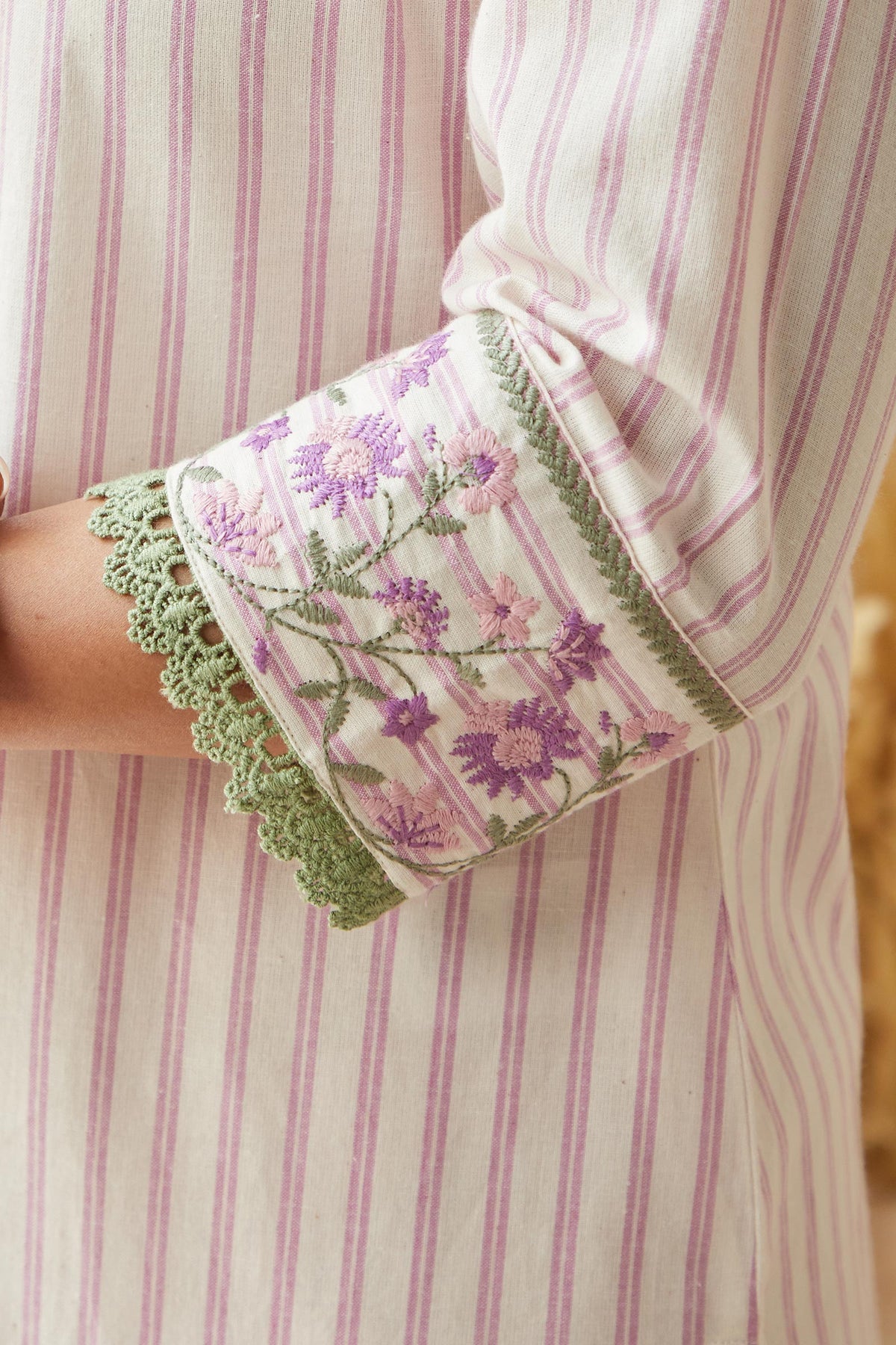 Our Gulbarg Amira Kurta showcases a pristine colour palette on soft Cotton fabric. Styled in a Straight silhouette, it exhibits precisely embroidered floral motifs around the neckline and cuffs. The delicate lace detailing on this elegant piece accentuates its appeal.