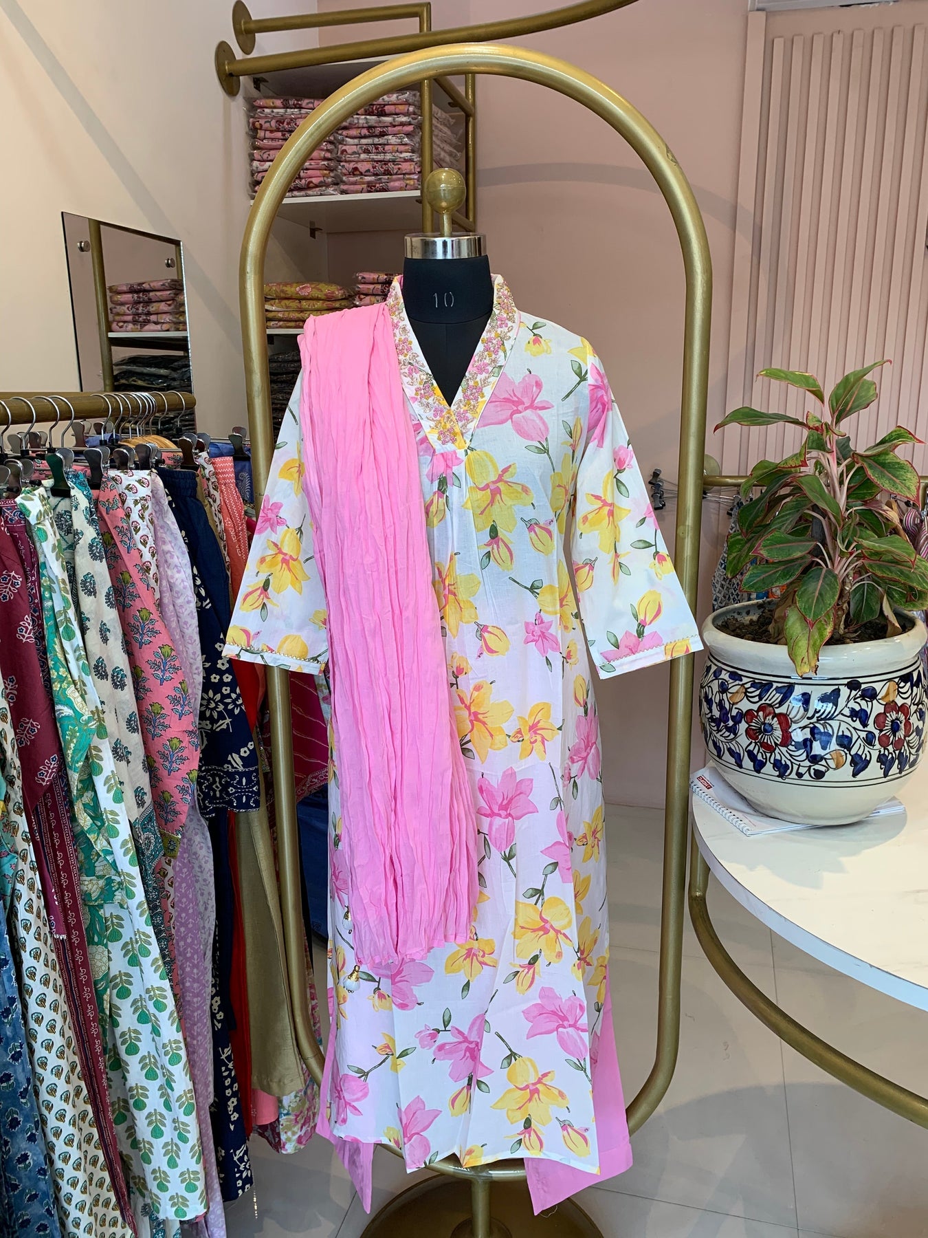 Festive delight, this kurta set is designed for all the days you want to keep things special and festive. This kurta set is a piece of art. The kurta comes with handembroidery in the neck.The soothing cotton fabric is the show winner. The set contains kurta,pants and dupatta.